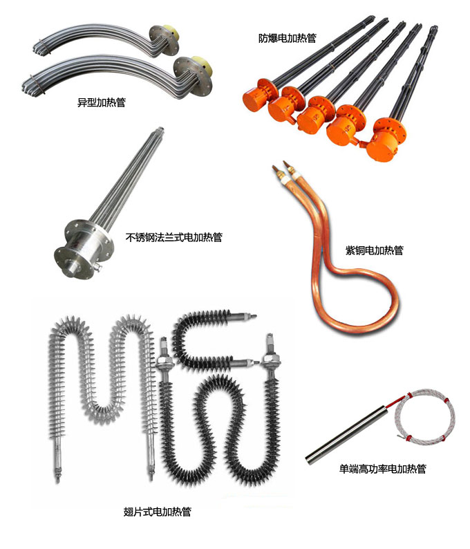 電壓可設計為:12-660V功率為:50W-20KW材質有:10#鐵、T4銅、1Cr18Ni9Ti不銹鋼、Ti鈦等。規格有:U型、W型、異形、帶散熱翅片電加熱管、輻射管等,