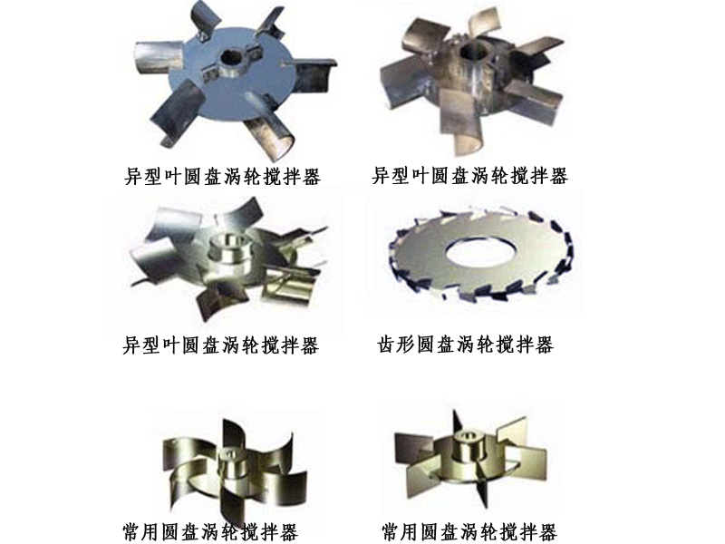 常用圓盤渦輪式攪拌器較之開啟渦輪式攪拌器,基本流型相同,同樣具有高剪切能力和較大的循環能力,區別在于中部多一圓盤,下面可以存一些氣體,使氣體分散更平穩,所以在氣體分散吸收過程中,它是很適合的。斜葉具有傾角,有軸向分流:彎葉具有后角,排出性能好,動力消耗低;螺距葉既有傾角又有后角,流型和性能部分差異。常用介質粘度μ<5×104cP,常用運轉速度n=10-300rpm,v=4-10m/s, 高轉速可達600rpm,常用尺寸DJ:L:b=20:5:4,DJ/D=0.2-0.5,斜葉傾角45°,60°,后彎角=45°。